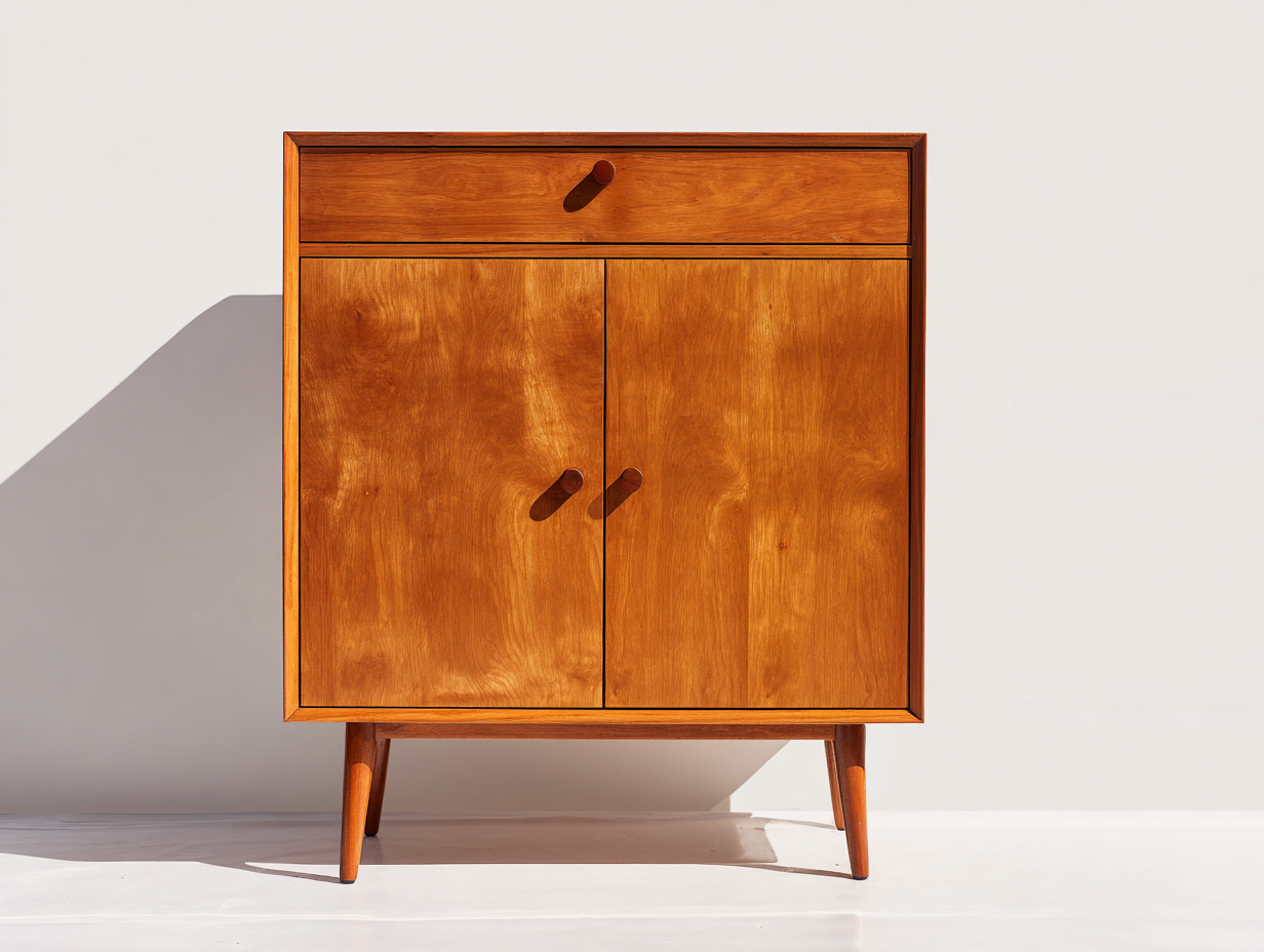 Realizzato interamente in legno massello con finitura marrone caldo, l'armadio mette in evidenza le venature naturali. È dotato di due ante frontali e di un cassetto superiore, ideali per una disposizione funzionale dello spazio. Le gambe in legno leggermente inclinate assicurano stabilità e continuità stilistica.