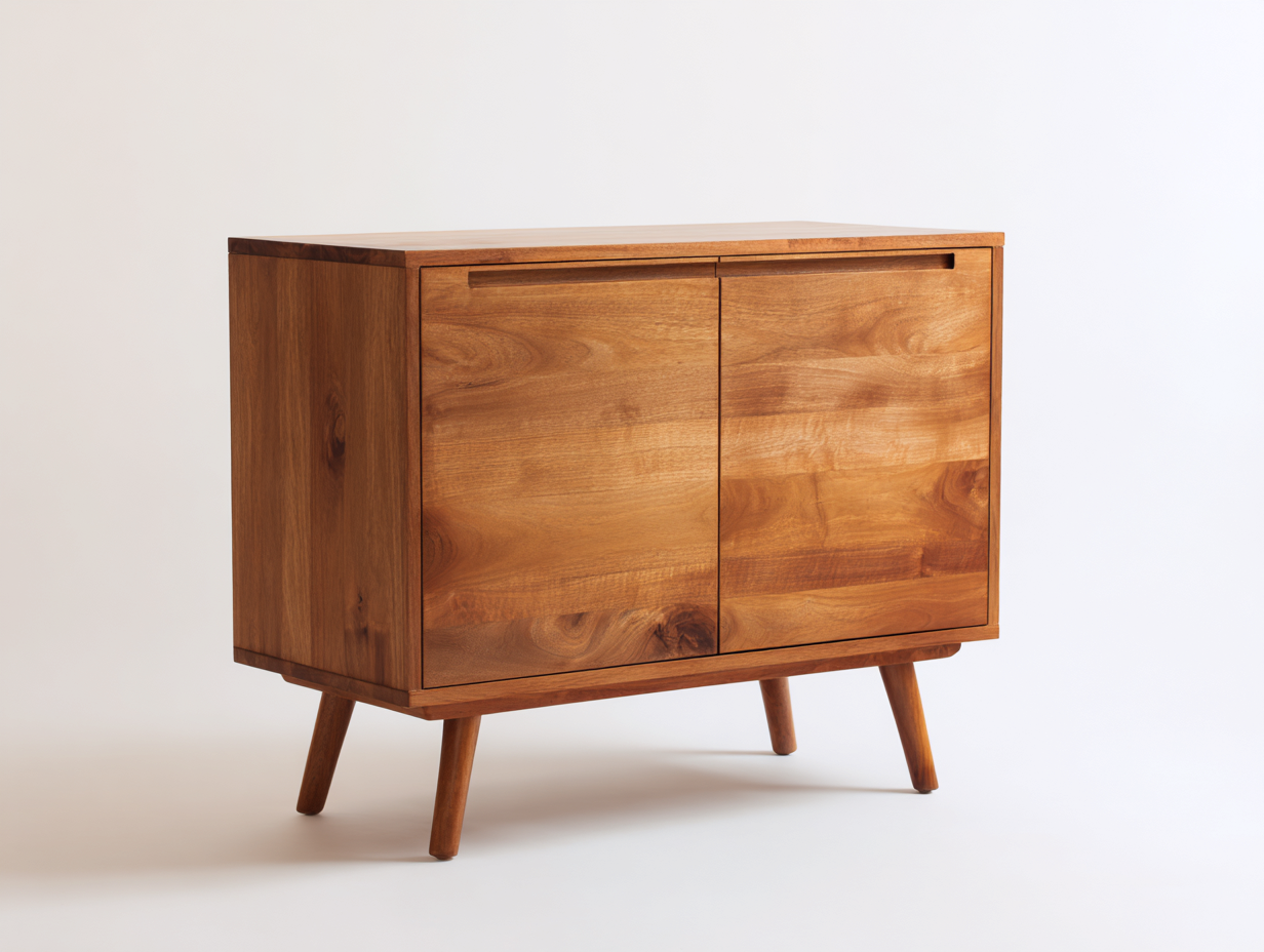 Realizzato in legno massello con finitura naturale, l'armadio valorizza le venature autentiche del legno. Le ante frontali consentono un accesso comodo allo spazio interno, mentre la base con gambe in legno inclinate assicura stabilità.