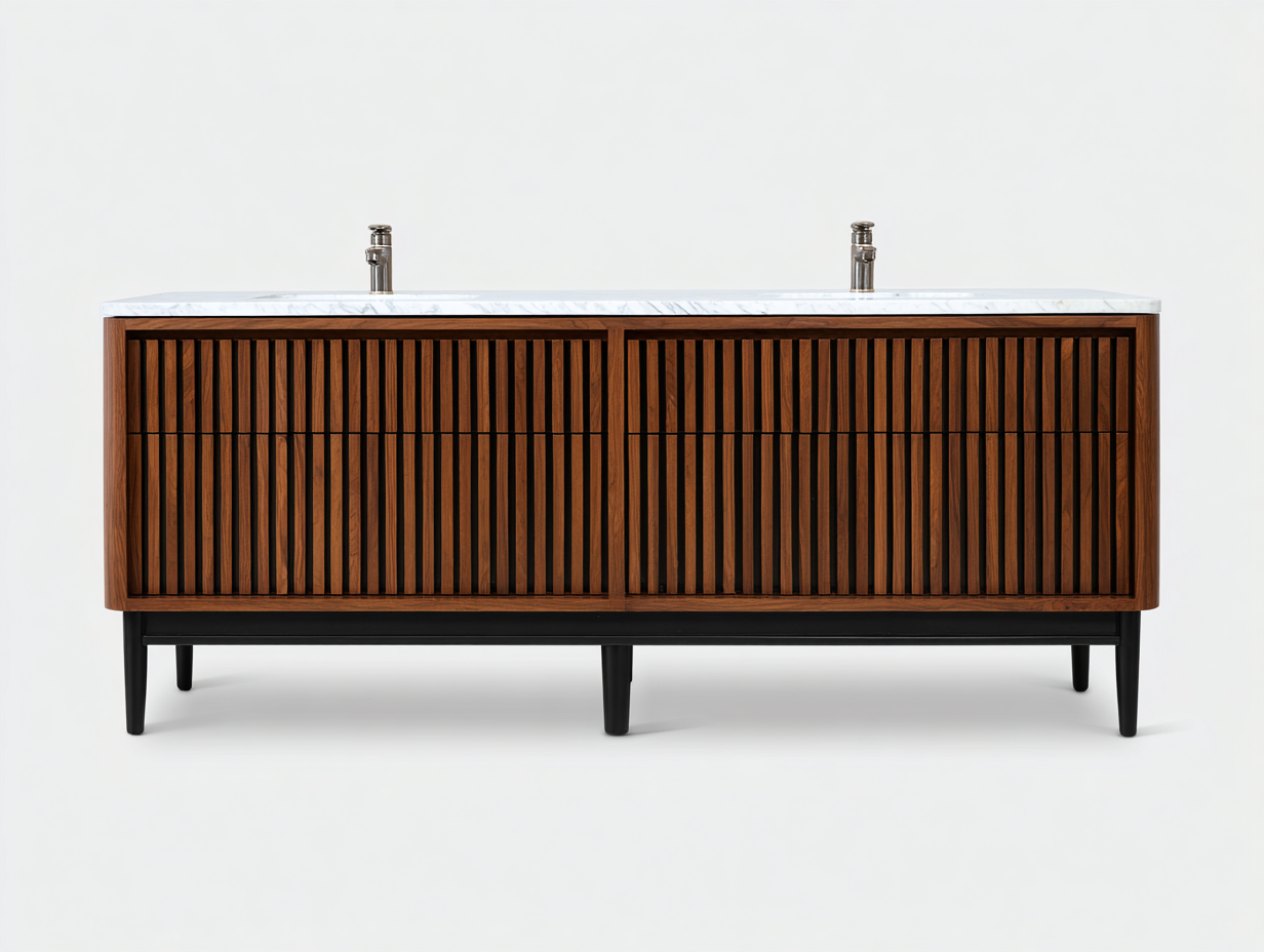 Il mobile è realizzato in legno massello con finitura effetto noce di colore marrone, caratterizzato da frontali con listelli verticali che aggiungono ritmo visivo e profondità. Il piano superiore è in marmo naturale bianco, resistente all'umidità e facile da mantenere. I piedini in metallo nero garantiscono solidità e stabilità.