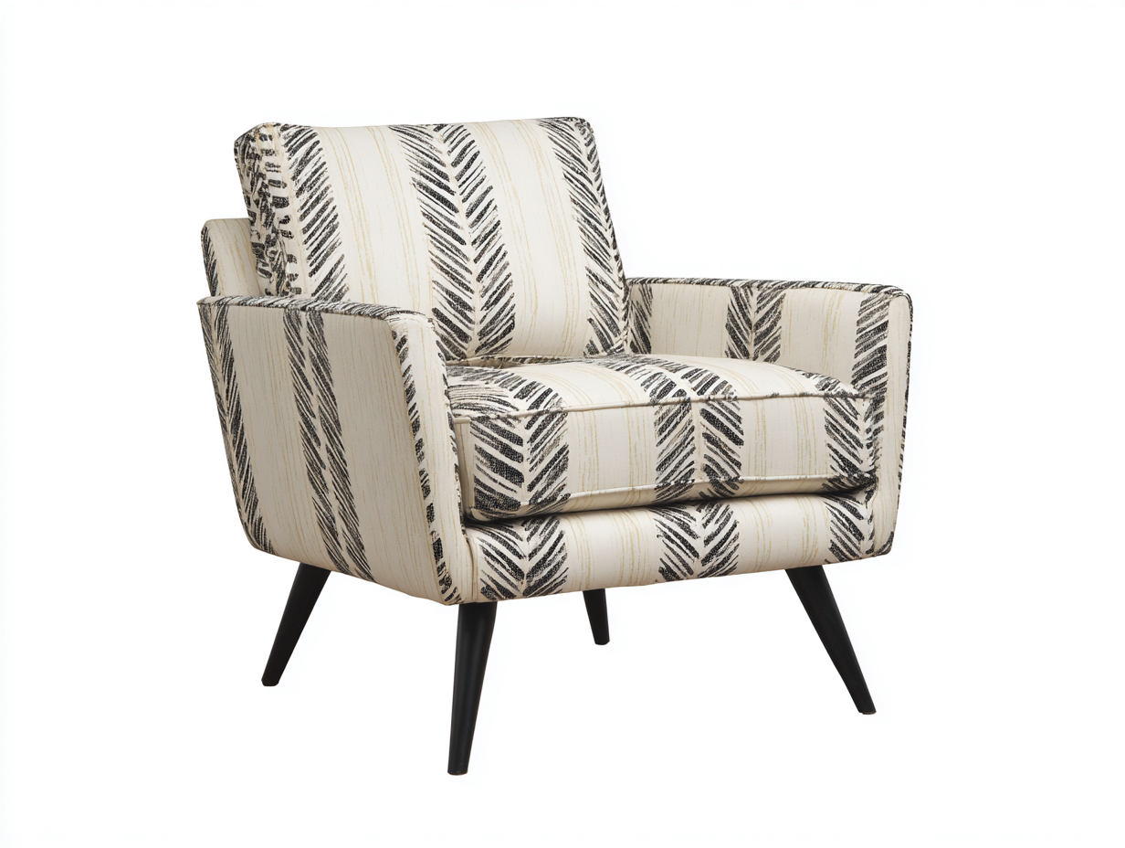 Il rivestimento è realizzato in tessuto di colore beige con motivo grafico nero, caratterizzato da una trama visibile che dona personalità e un tocco contemporaneo. L'imbottitura interna assicura un buon sostegno e comfort nel tempo. Le gambe sono realizzate in legno massello con finitura scura, solide e stabili.